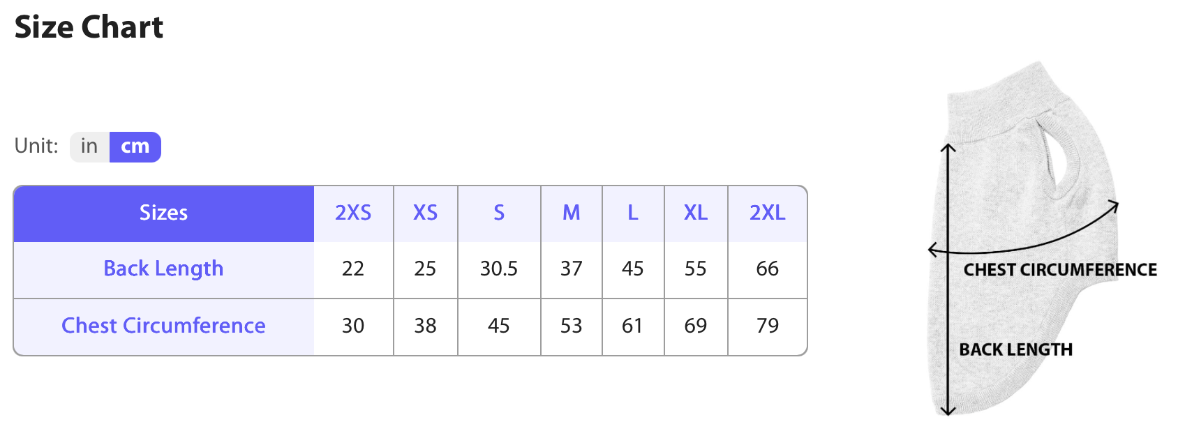 How to measure: Measure your pet's back length from the base of the neck to the start of the tail, and the chest circumference at the widest part of the chest. The sweaters have a little give, so if your pet is between sizes, size down for a snug fit.
